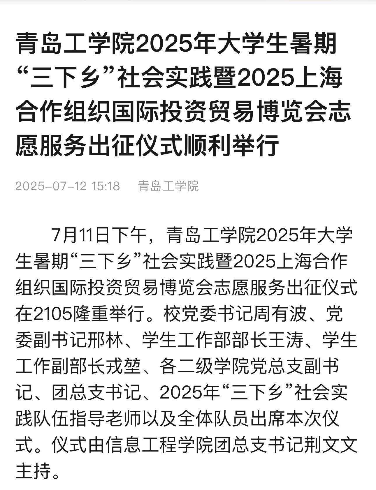 《青岛新闻》青岛工学院2025年大学生暑期“三下乡”社会实践暨2025上海合作组织国际投资贸易博览会志愿服务出征仪式顺利举行