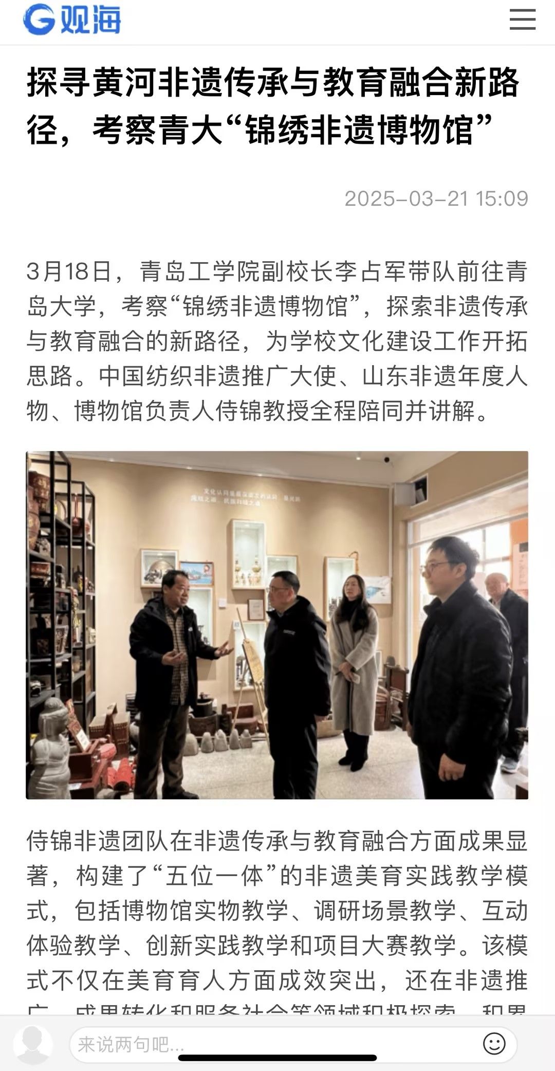 《观海新闻》——探寻黄河非遗传承与教育融合新路径,考察青大“锦绣非遗博物馆”