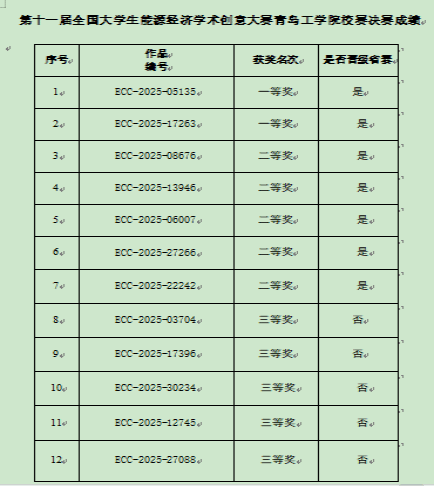校赛决赛作品获奖及晋级省赛情况经过严格评审,最终评选出一等奖2项、二等奖5项、三等奖5项,优胜队伍将代表青岛工学院参加山东省区域赛。大赛不仅为学子提供了展示学术能力的平台,也促进了能源经济领域的产学研结合,助力“双碳”人才培养。