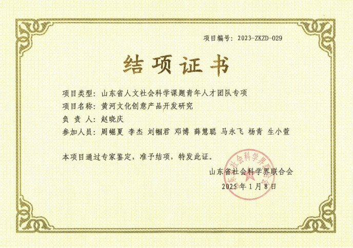 近期,由第2批山东省哲学社会科学青年人才团队“青岛工学院服务黄河国家战略研究团队”负责人赵晓庆教授主持的山东省人文社会科学项目《黄河文化创意产品开发研究》顺利通过结项验收。该课题立足服务黄河重大国家战略,深入挖掘黄河文化蕴含的时代价值,充分体现了青岛工学院服务国家战略、助力强省建设、弘扬中华优秀传统文化的使命担当。
