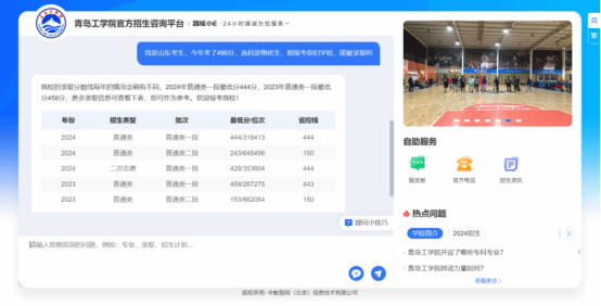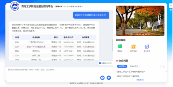 随着高考改革的深入推进和招生工作的数字化转型,传统的招生模式已难以满足日益增长的个性化需求。近日,青岛工学院招生问答系统全面接入国内顶尖AI平台DeepSeek,构建起智能化、精准化、高效化的招生服务体系,为考生及家长提供全天候、多维度的高效咨询服务。这一创新举措标志着我校的招生服务迈入AI深度赋能新阶段。