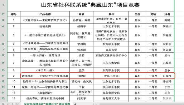 近日,山东省社科联系统“典藏山东”项目大赛圆满收官。青岛工学院马克思主义学院社会工作专业学生白淑洋凭借作品《琉光璃彩——千年窑火中的淄博琉璃》在脚本类竞赛中脱颖而出,斩获一等奖,为传承齐鲁文脉、讲好山东故事注入青春力量。
