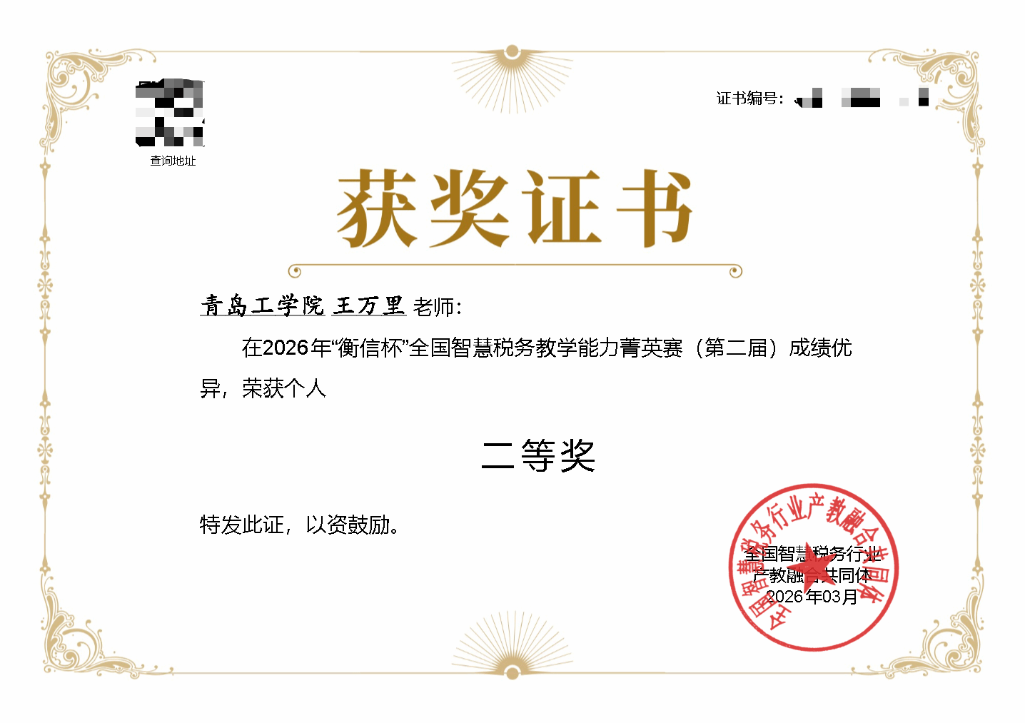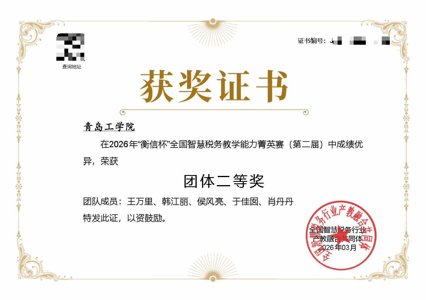近日,第二届“衡信杯”全国智慧税务教学能力菁英赛圆满落下帷幕,我校经济管理学院教师团队放弃寒假休息时间,积极参赛,最终凭借扎实的专业功底和卓越的实战能力,荣获教师团体二等奖,王万里老师荣获个人二等奖,侯风亮、韩江丽老师分别荣获个人三等奖。