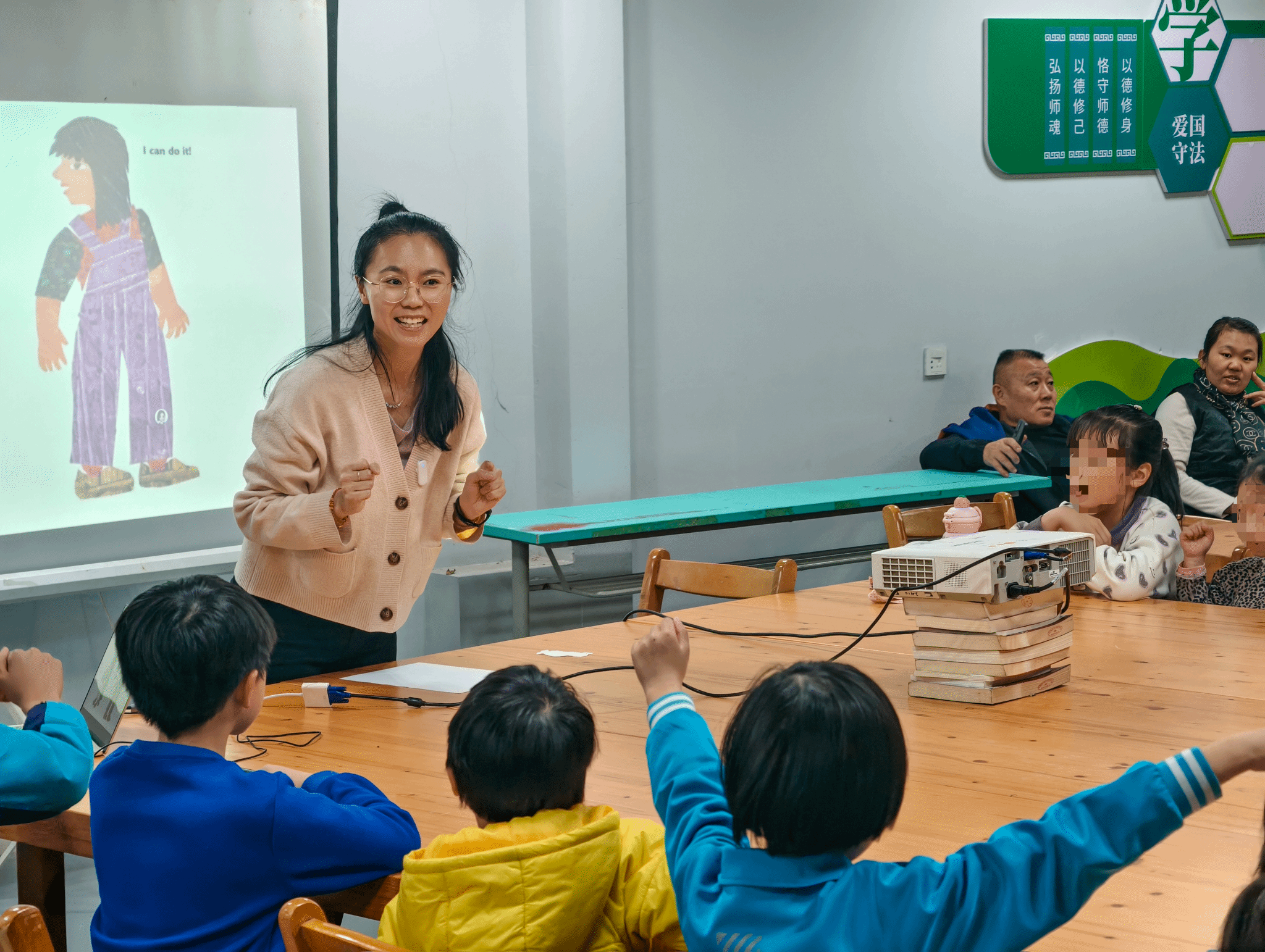 活动现场暖意融融,覆盖三四岁学龄前幼儿至六年级小学生,在两位英语专业老师的带领下尽情沉浸在外语的欢乐世界里。欢快的英语歌谣律动环节,孩子们跟着旋律拍手、舞动身体,边听边唱、边玩边学,动感的节奏和趣味的互动彻底打破了英语学习的枯燥感,轻松感受英语韵律之美。在绘本阅读环节,老师们紧扣与视频契合的主题,用生动的讲解、形象的动作带领孩子们品读绘本,同步增设创意涂鸦涂色实践环节,让抽象的语言知识变成看得见、摸得着、能动手的趣味体验,实现有温度、有意义的语言输入。