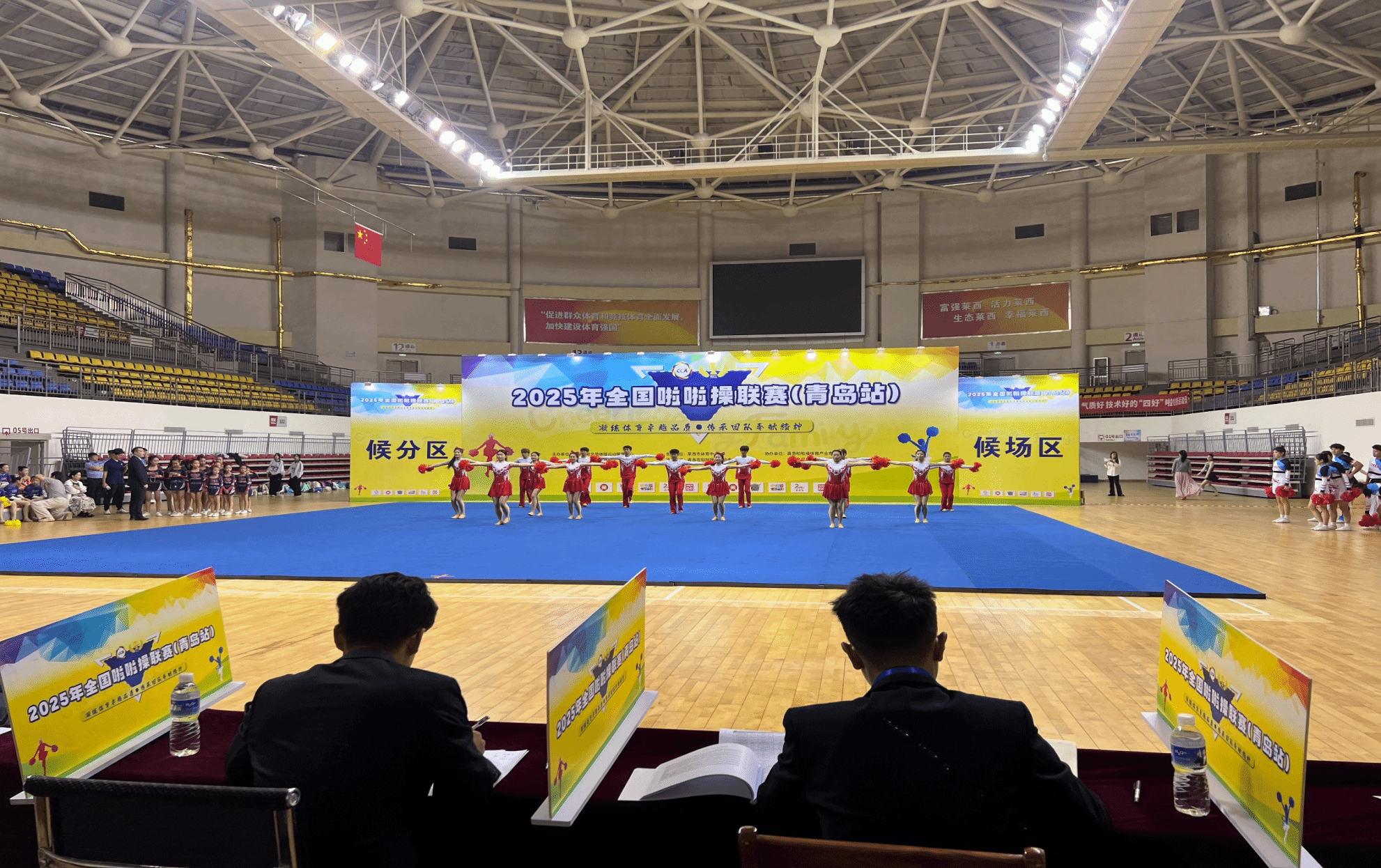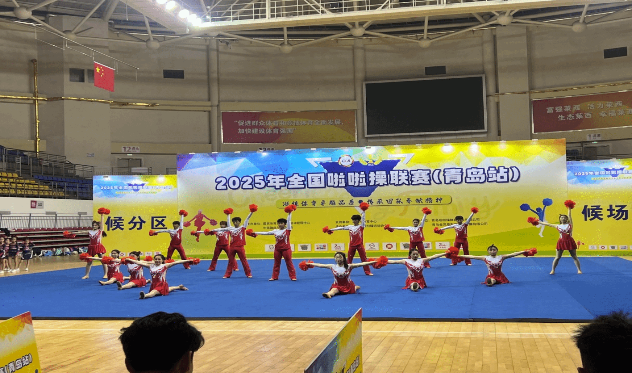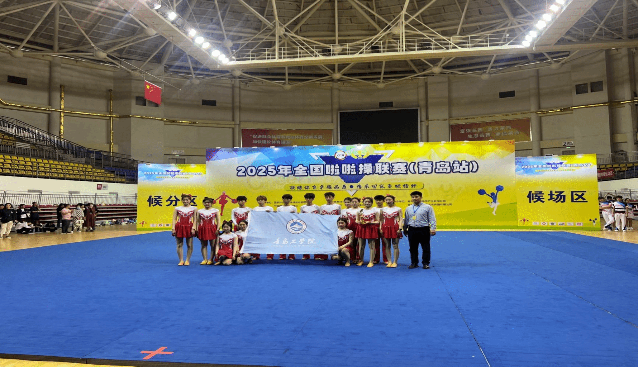 2025年9月26-28日,2025年全国啦啦操联赛(青岛站)在青岛市莱西市体育中心体育馆举办。青岛工学院社会体育指导与管理专业学子组成的代表队,在公开青年甲组花球规定动作项目中凭借精湛技艺与完美配合脱颖而出,取得第一名的好成绩,为学校赢得佳绩。