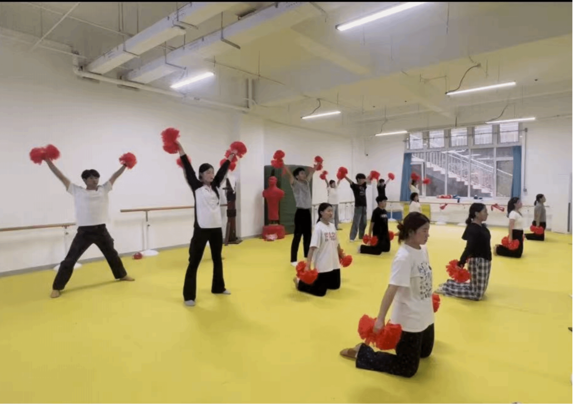 耀眼成绩的背后,是日复一日的坚持与付出。自备战以来,队员们在张馨月、韩丹妮两位教师的指导下,制定了精细化训练计划。训练馆里,每天都能看到两位教师带领队员们辛苦训练的场景,镜面见证着他们从基础动作打磨到成套动作磨合,练习过程中队员们不厌其烦的逐帧纠正手位偏差与节奏误差。面对2025级新同学的加入,老队员更是主动承担起 “传帮带” 职责,帮助新队员掌握动作细节,帮助团队快速形成战斗力。