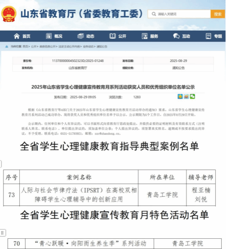 近日,山东省教育厅发布了《2025年山东省学生心理健康宣传教育月系列活动获奖人员和优秀组织单位名单公示》,我校“青心跃暖·向阳而生养生季”系列活动获评山东省学生心理健康宣传教育月特色活动,程亚楠、刘悦老师撰写的《人际与社会节律疗法(IPSRT)在高校双相障碍学生心理辅导中的创新应用》获评山东省学生心理健康教育指导典型案例,相关成果获专家组高度认可,体现了我校在心理育人路径与方法上的持续探索。