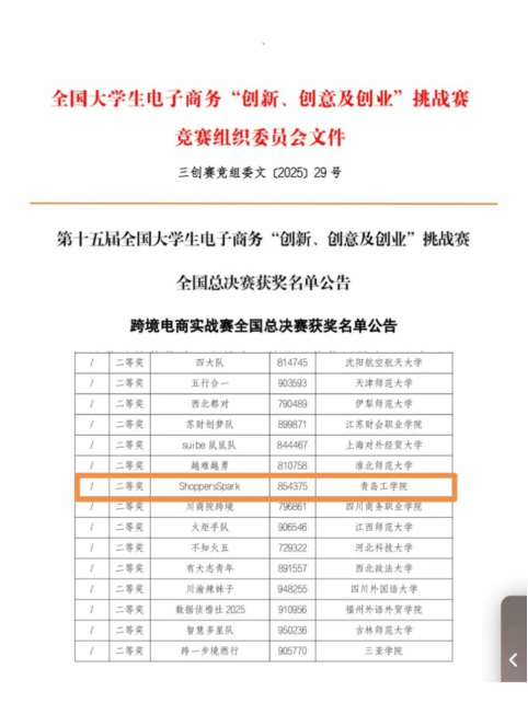 近日,第十五届全国大学生电子商务“创新、创意及创业”挑战赛(以下简称“三创赛”)全国总决赛圆满落幕。青岛工学院外语学院ShopperSpark团队凭借出色的跨境电商实战项目,荣获全国二等奖,充分展示了学校在跨学科复合型人才培养方面的扎实成效。