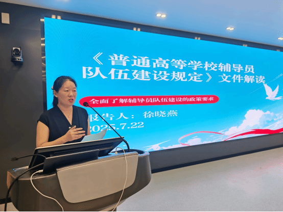 在专题解读环节,外语学院党总支副书记徐晓燕对《普通高等学校辅导员队伍建设规定》进行了深入剖析。她重点围绕思想理论教育和价值引领、党团和班级建设、学风建设、心理健康教育与咨询、网络思想政治教育、校园危机时机应对等核心领域,结合学生工作实际案例,阐述了辅导员如何以党的最新理论成果为指引,创新育人方式。她强调:“辅导员需紧跟时代步伐,通过多元化手段将正确价值观融入学生日常学习与生活,引导学生筑牢理想信念之基。”
