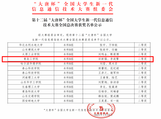 近日,第十二届“大唐杯”全国大学生新一代信息通信技术大赛全国总决赛落下帷幕。青岛工学院信息工程学院的田新强与李政繁同学凭借扎实的专业功底和出色的临场表现,在激烈角逐中脱颖而出,荣获全国二等奖,为学校赢得了荣誉。
