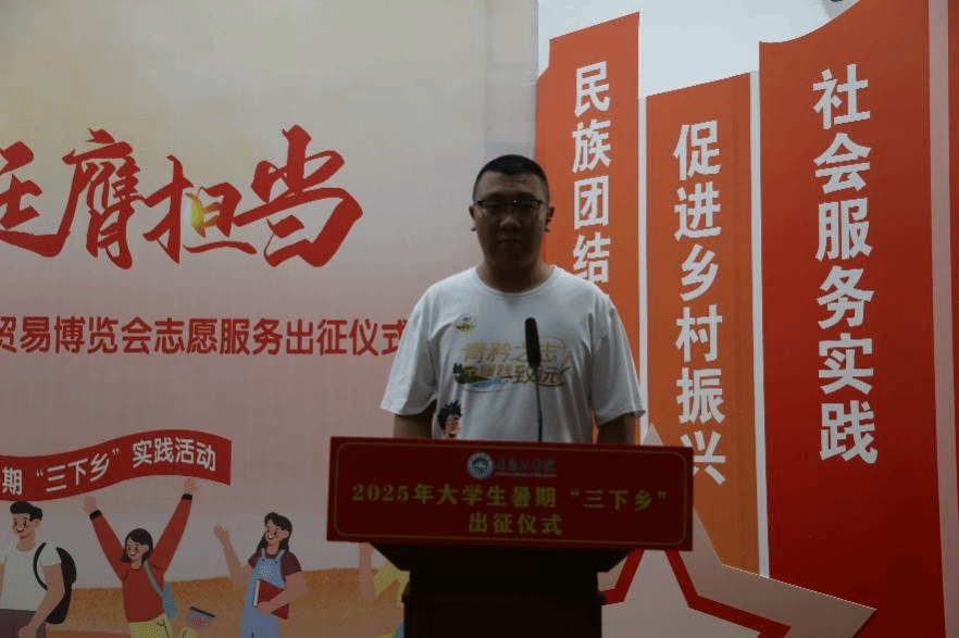 2025年暑期“三下乡”社会实践核心团队“青音颂志愿实践团”代表田博翔同学发言,他代表全体三下乡社会实践团队成员承诺:将始终牢记“胸怀天下、造福人类”的校训精神,以青春之我、奋斗之我,在乡村和基层的广阔舞台上,书写精彩篇章,为推进中国式现代化建设贡献青工学子的智慧与力量!