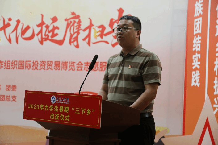 校党委书记周有波作动员讲话。他代表学校党委向即将启程的师生表示诚挚问候与感谢,并对即将踏上行程的师生们提出三点希望:一是树牢青春理想,争做习近平新时代中国特色社会主义思想的坚定信仰者;二是锤炼过硬本领,争做服务国家经济社会发展的积极奋进者;三是涵育青春品格,争做下沉为民服务基层一线的模范践行者。他勉励全体师生在社会实践的广阔舞台上,在推进强国建设、民族复兴伟业中展现青春作为、彰显青春风采、贡献青春力量,奋力书写为中国式现代化挺膺担当的青春篇章!
