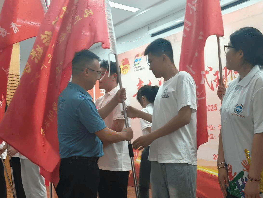 授旗仪式上,校党委副书记邢林为11支校级重点立项核心团队授旗。队员们接过旗帜,也接过了沉甸甸的青春使命。全体实践队代表共同舞动旗帜,为青春增添亮丽色彩。