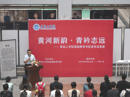 2025年6月24日上午10点,青岛工学院2号教学楼内热闹非凡,“黄河新韵·青衿志远”美育成果展在此隆重开幕。青岛工学院副校长李占军、基础教育学院院长姜翠萍、副院长任建红、党总支副书记张洋、公共艺术教研室各位老师以及优秀学生代表共同出席了本次开幕式。