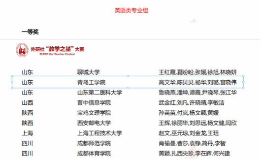 近期,在2025年外研社“教学之星”大赛全国复赛中,我校外语学院英语教研室“文化与传播”教学团队凭借其卓越的教学设计和精彩的课堂呈现,在竞争激烈的“英语类专业组”组别中获得一等奖,这一佳绩充分展现了我院教师出色的教学能力和先进创新的教学理念。