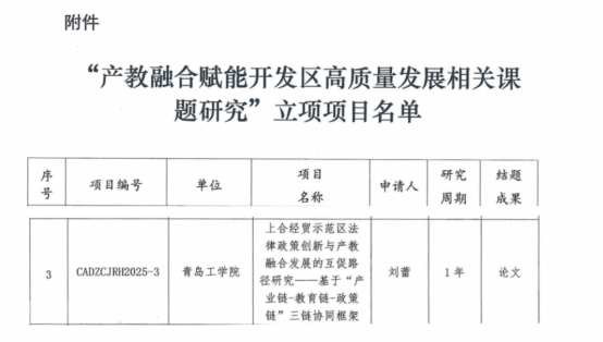 近日,青岛工学院刘蕾副教授申报的中国开发区协会人力资源服务与产教融合专业委员会产教融合赋能开发区高质量发展研究课题《上合经贸示范区法律政策创新与产教融合发展的互促路径研究——基于“产业链-教育链-政策链”三链协同框架》成功获批立项。这一重要课题的获批,是学校贯彻落实服务国家战略、助力上合示范区高质量发展使命担当的又一有力举措,充分体现了青岛工学院坚持立足区域、主动融入“一带一路”建设的担当与成效。