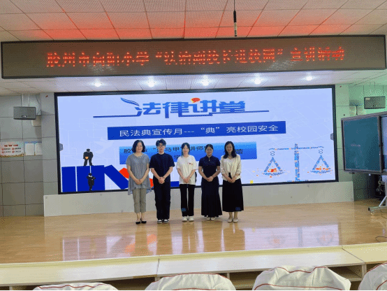 6月5日,马克思主义学院知识产权专业负责人、胶州市“蓝马甲”普法讲师刘蕾副教授受胶州市司法局阜安司法所邀请,带领三名知识产权专业学生走进胶州市向阳小学,为五年级部200余名学生开展《民法典“典”亮校园安全》主题普法讲座。此次活动以创新互动形式传递法治理念,将高校专业资源与青少年普法教育深度融合,为校园安全和未成年人权益保护注入高校力量。