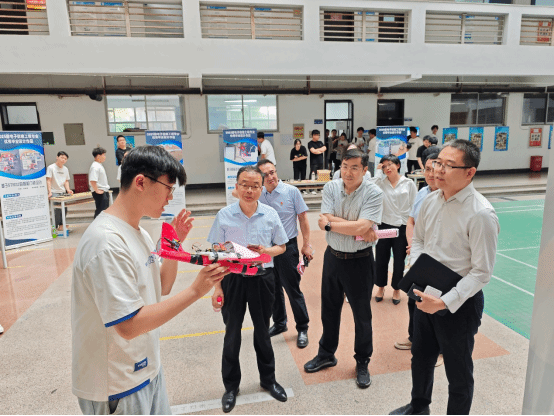 活动当日,学校党委书记周有波、校长刘连新、副校长李占军、副校长任传波、副校长邢林以及教务处长郭玉芝等一行亲临现场,与信息工程学院领导班子、教师代表以及众多师生共同见证这一科技盛会。在参观过程中,校领导与学生亲切交流,详细询问作品的创作思路、技术难点及创新点,对学生们的创新思维和实践能力给予了高度评价,并鼓励大家继续保持对科技的热情与探索精神,勇攀科学高峰。