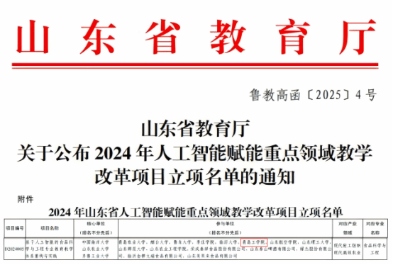 近日,山东省教育厅公布了2024年人工智能赋能重点领域教学改革“111计划”项目立项名单。青岛工学院作为参与单位,成功获批“基于人工智能的食品科学与工程专业教育教学体系重构与实践(项目编号:D2024005)”项目,本项目具体由食品工程学院参与完成。这一成果标志着学院在探索人工智能与教育教学深度融合、提升专业建设水平方面取得了重要突破。