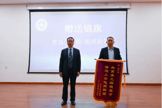 刘连新校长向胶州市商务局赠送“共育青工跨境英才 谱写上合电商新篇”锦旗,象征着双方在跨境电商人才培养领域的合作迈上新台阶。